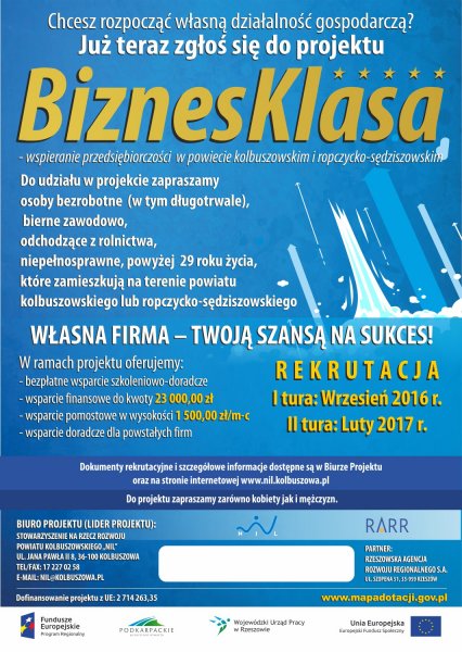 Stowarzyszenie Na Rzecz Rozwoju Powiatu Kolbuszowskiego „ NIL” ma przyjemność ogłosić iż otrzymało dofinansowanie na realizację projektu BIZNESKLASA – wspieranie przedsiębiorczości w powicie kolbuszowskim i ropczycko-sędziszowskim, w ramach Regionalnego Programu Operacyjnego Województwa Podkarpackiego na lata 2014-2020, współfinansowanego ze środków Europejskiego Funduszu Społecznego.
