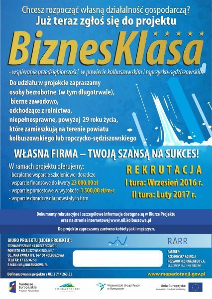W związku z zakończeniem rekrutacji do I edycji projektu "BIZNESKLASA - wspieranie przedsiębiorczości w powiecie kolbuszowskim i ropczycko-sędziszowskim", w zakładce projektu dostępne są wyniki rekrutacji i naboru do projektu: http://nil.kolbuszowa.pl/projekty/biznesklasa