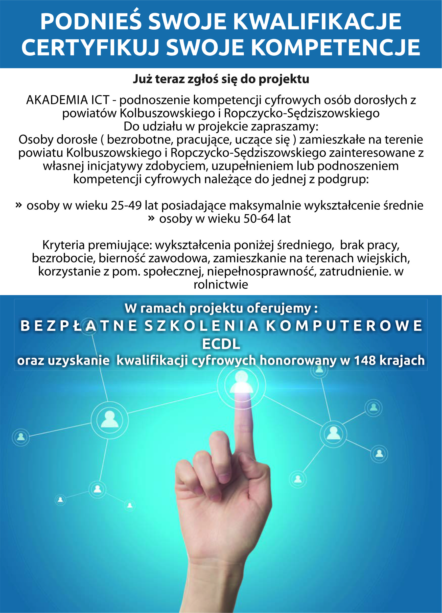 Podnoszenie kompetencji cyfrowych osób dorosłych z powiatu Kolbuszowkiego i Ropczycko-sędziszowskiego.